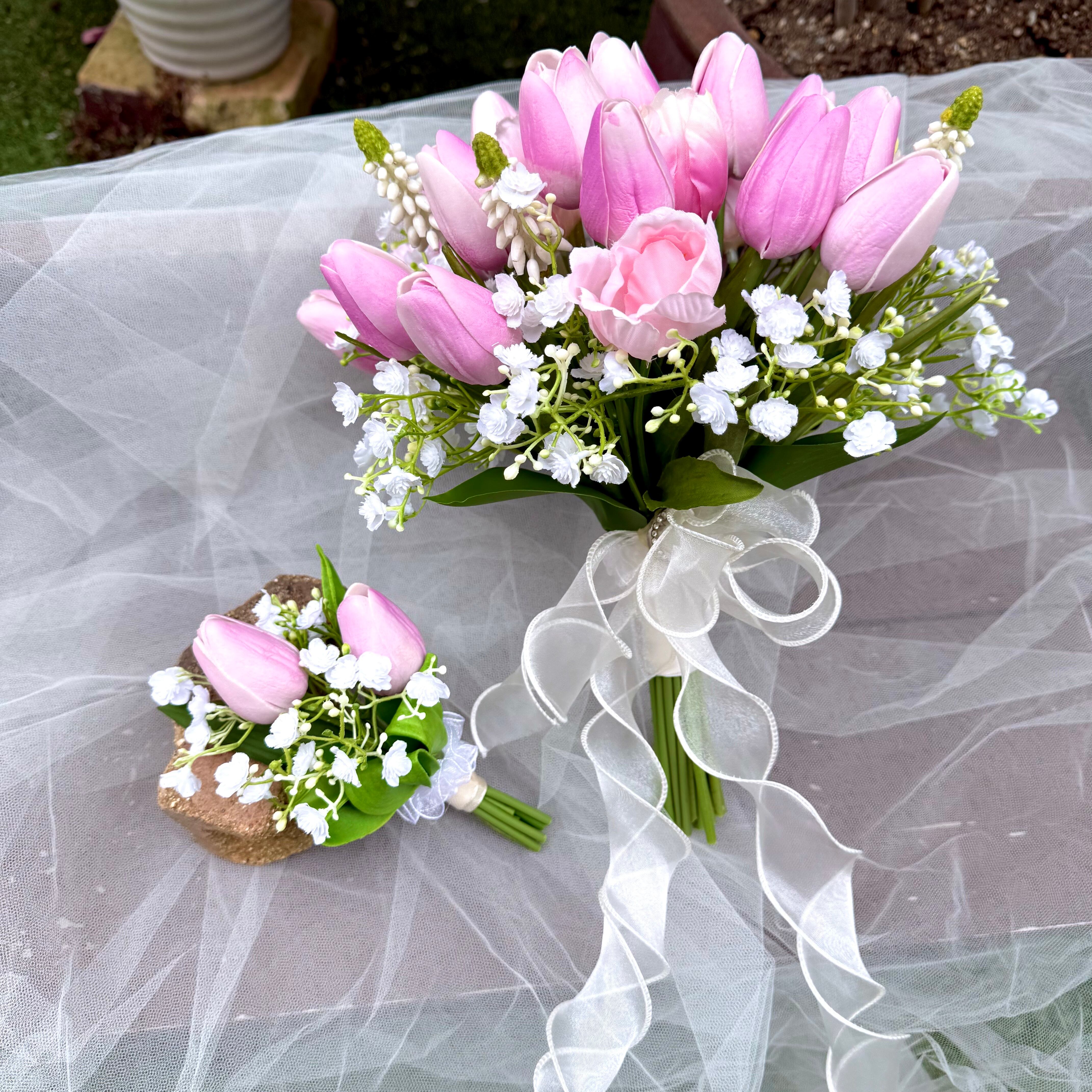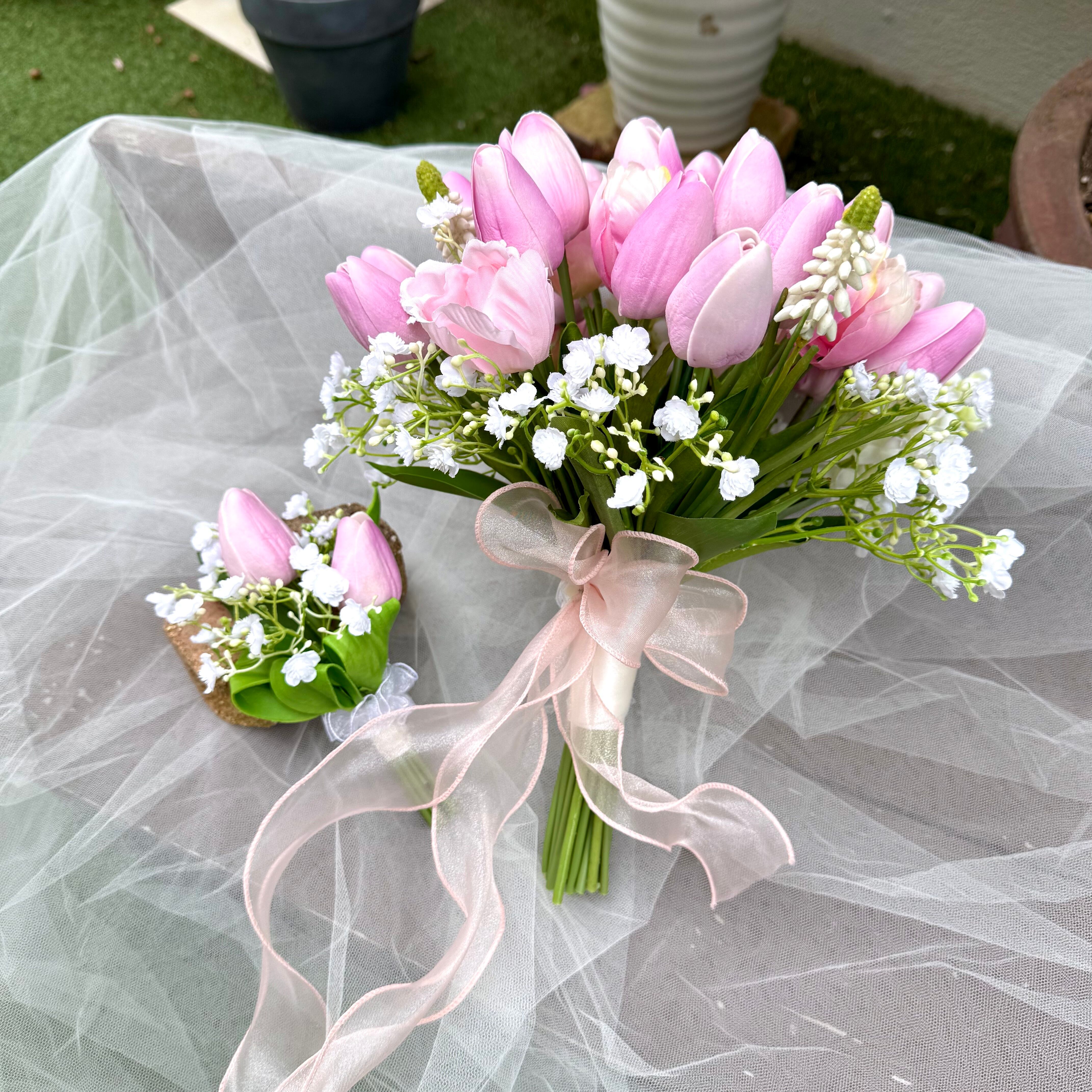 ピンクバイオレットのチューリップブーケ(ブートニア付)