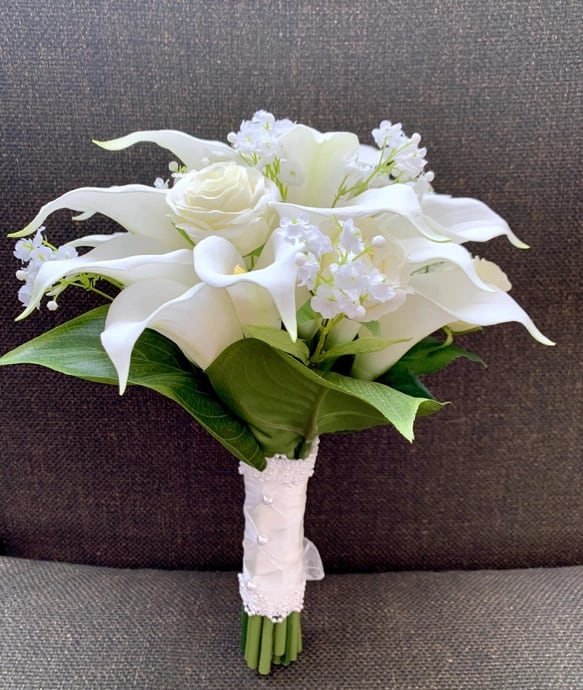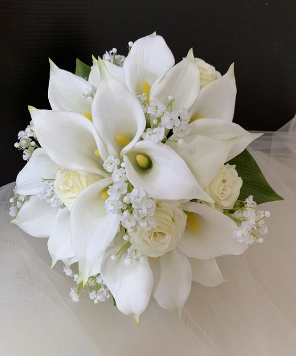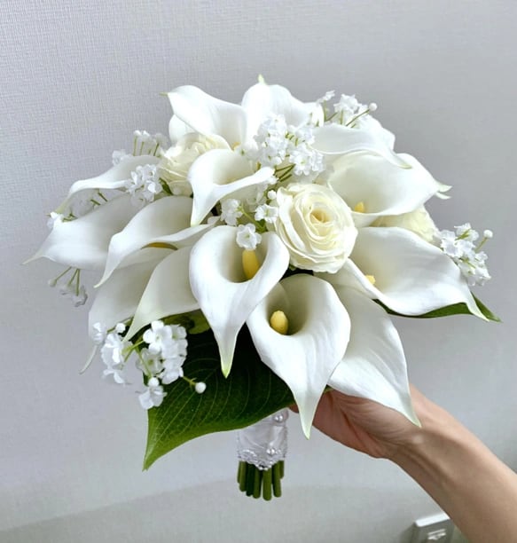 カラーとかすみ草のウエディングブーケ(ブートニア付き)