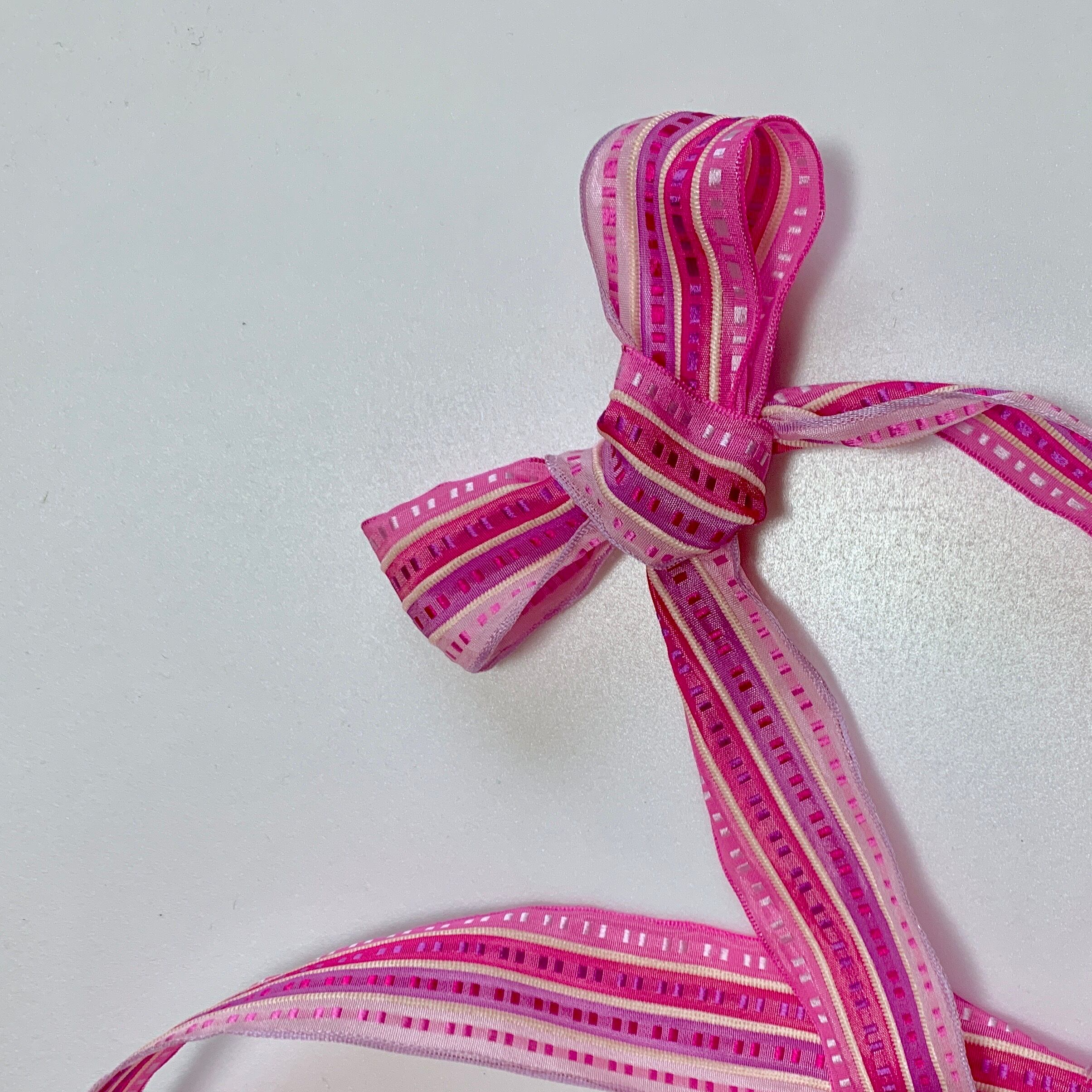 パープルと、ピンクの濃淡で色分けされた上質感あふれる織リボンです。
